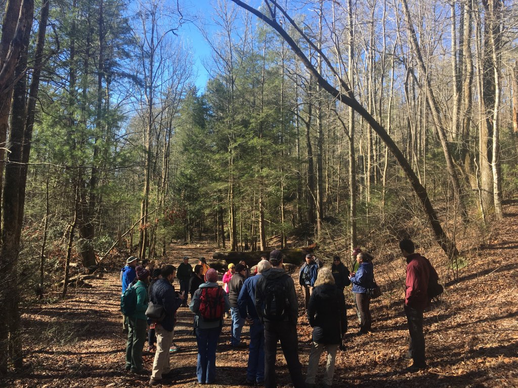 (A) Fruiting bodies of Caliciopsis pinea protruding from a bark canker. As part of an insect-pathogen complex, the feeding behaviors of eastern white pine bast scales are hypothesized to create ideal infection courts for this pathogen to penetrate the bark and establish in the cambium. These cankers are leading to white pine dieback symptoms. (B) A cluster of eastern white pine bast scales (Matsucoccus macrocicatrices) found on the bark surface feeding on the host tree’s vascular fluid. (C) Eastern white pine trees exhibiting dieback symptoms. Photo credit: Lori Chamberlain. (D) State, federal, and university researchers attend a field trip in the Southern Appalachian Mountains of Georgia, USA, as part of the first White Pine Health Workshop in February 2018.