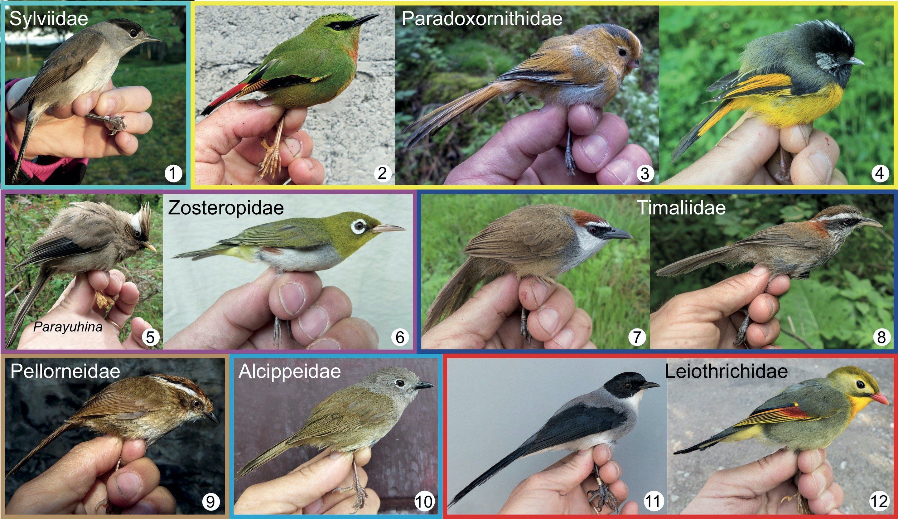 Image 2: Representatives of the seven babbler families. Family Sylviidae: (1) Blackcap Sylvia atricapilla. Family Paradoxornithidae: (2) Fire-tailed Myzornis Myzornis pyrrhoura, (3) Fulvous Parrotbill Suthora fulvifrons, (4) Golden-breasted Fulvetta Lioparus chrysotis. Family Zosteropidae: (5) White-collared Yuhina Parayuhina diademata, (6) Chestnut-flanked White-eye Zosterops erythropleurus. Family Timaliidae: (7) Chestnut-capped Babbler Timalia pileata, (8) Streak-breasted Scimitar-babbler Pomatorhinus ruficollis. Family Pellorneidae: (9) Rusty-capped Fulvetta Schoeniparus dubius. Family Alcippeidae: (10) David’s Fulvetta Alcippe davidi. Family Leiothrichidae: (11) Black-headed Sibia Heterophasia desgodinsi, (12) Red-billed Leiothrix Leiothrix lutea. All photos: Per Alström..