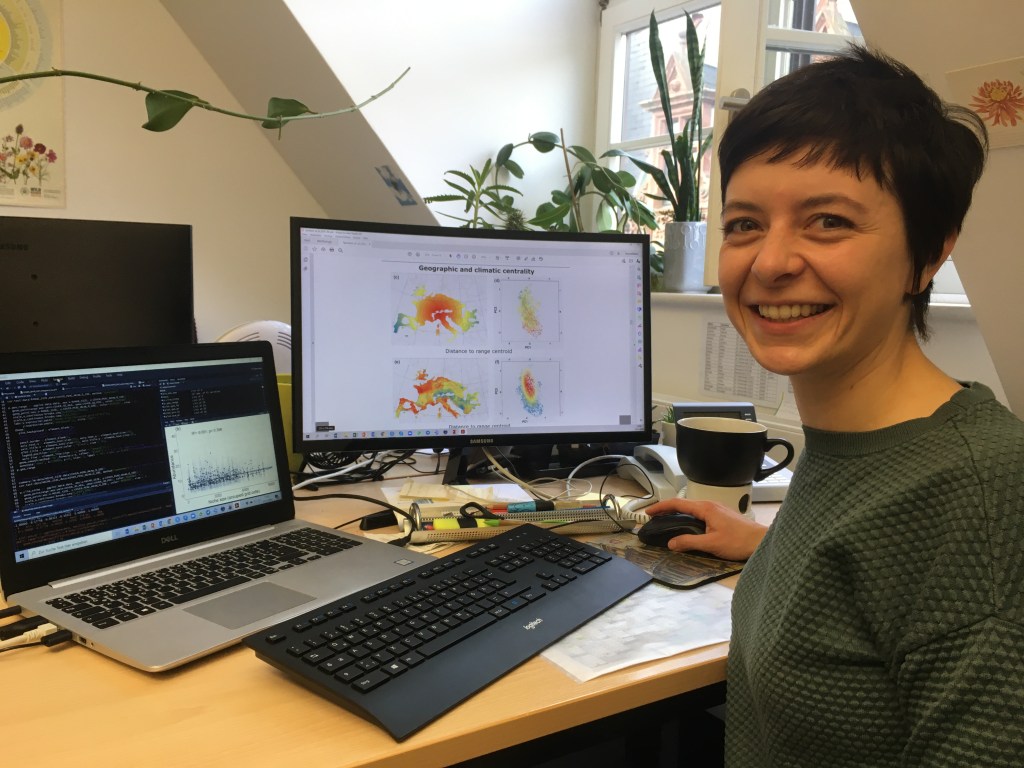 Maria working at her tidied-up desk at the Martin-Luther University Halle, Germany. Typical setting of a macro ecologist: analysing data and creating colourful maps. (Picture credit: Carolin Plos)