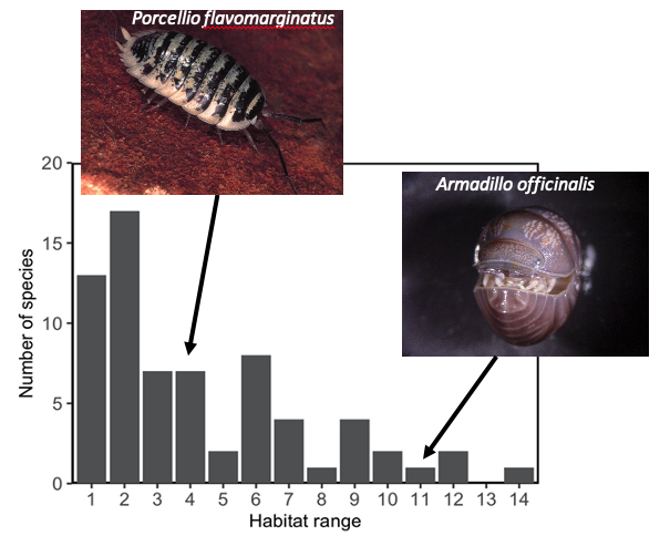 The habitat range distribution of terrestrial isopods on central Aegean islands. Porcellio flavomarginatus is a, not very narrow, specialist that exploits limestone-rich areas and rocky outcrops in dry Mediterranean habitats, while Armadillo officinalis is a generalist exploiting all Mediterranean-type ecosystems.