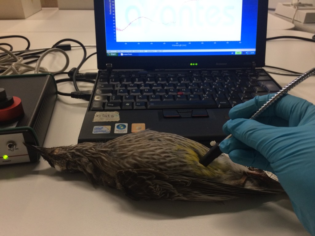 Challenges you faced on the way. At the start of the project, we randomly chose fifty passerine species. However, we needed enough specimens per species to get a good enough average of the species’ colour reflectance. I had to check that each species had at least twenty male specimens listed in Museums Victoria and Australian National Wildlife Collection specimen database. Unfortunately, the problem did not end there! It became clear after my first visit that I was unable to obtain decent measurements from some of the specimens from our original list of species. Some specimens had unclear labels without a location, or I could not determine its sex. Some were moulting so the feathers were not showing carotenoid colours. Other birds had missing feathers or no carotenoid patch due to the taxidermy process. In the end, I had to drop one of the species as there were not enough specimens to get a good sample size. Not everything will happen as planned in an initial research proposal!
