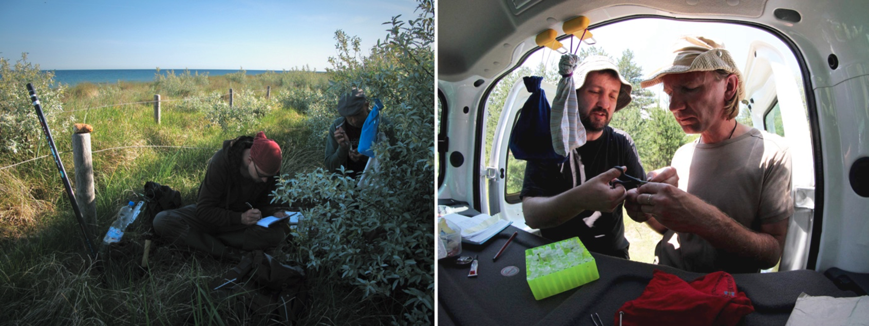 Roland Neumann and Benjamin Metzger banding and measuring common rosefinches in the dunes of the Baltic Sea in Germany (left). Tomas Albrecht and Jaroslav Cepak preparing their mobile lab after a successful catch of rosefinches in the mountains of Bulgaria (right). (Photo credit: Simeon Lisovski, Pavel Munclinger)