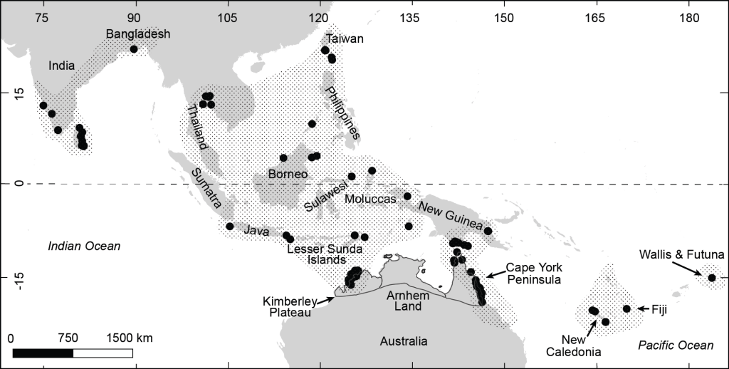 Key methodologies. To investigate exchange tracks between Southeast Asia and northern Australia, we conducted a molecular phylogeographic case study on a species of a tropical tree called Aglaia elaeagnoidea (in Meliaceae, the mahogany family), which is distributed from India, throughout Southeast Asia, in the Kimberley and Cape York Peninsula of Australia and out into the Pacific islands. We used Single Nucleotide Polymorphisms (SNPs) obtained using DArT-seq from samples across the range of A. elaeagnoidea and conducted a variety of population genetic analyses. In conjunction with this, we did some Environmental Niche Modelling of the Last Glacial Maximum when sea levels were lowest between Southeast Asia and Australia to understand where suitable tracks of environment for A. elaeagnoidea might have been at that time. A particularly nifty thing about this study is that we obtained most of our samples from herbarium specimens, including a specimen collected by Robert Wight almost 200 years ago!