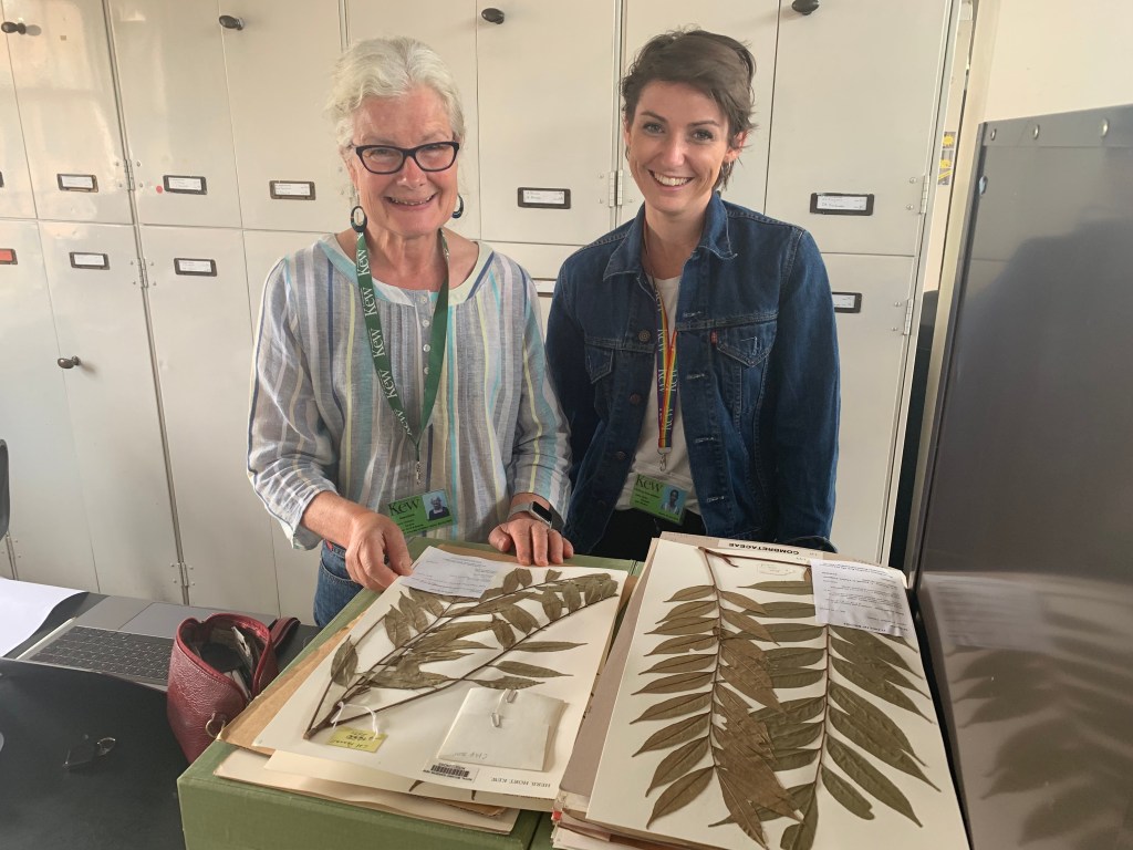 Dr. Caroline Pannell (the monographer of Aglaia; left) and Elizabeth Joyce (right) looking through the Aglaia collection at Kew Herbarium in 2019 for sampling (Photo by Marija Joyce, reproduced with permission).