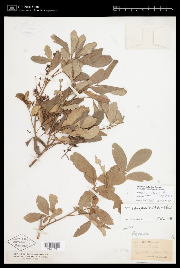 Image of the Aglaia elaeagnoidea specimen collected by Robert Wight in India in 1835 from which we were able to extract DNA and include in this phylogeographic study (Image courtesy of the C. V. Starr Virtual Herbarium of the New York Botanical Garden, http://sweetgum.nybg.org/science/vh/).
