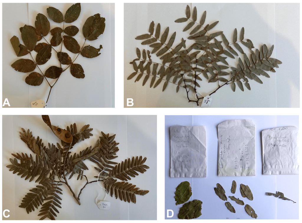 Some of the specimens that were collected in the frame of this study (A, B, and C: Brachystegia spiciformis, B. longifolia and B. boehmii). In addition to herbarium vouchers, we also collected leaflets and dried them using silica gel (in D, left to right: B. spiciformis, B. longifolia and B. taxifolia). DNA is generally better conserved using the latter approach.