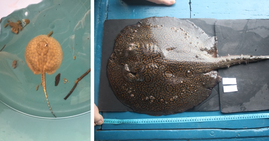 A juvenile stingray in a basin for transportation (right); an adult stingray and its beautiful color pattern, fresh on the boat (left).