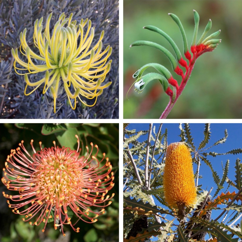 The plants of the GCFR (left) and SWAFR (right) have many of the same ecological adaptations and growth forms, nevermind the taxonomic affinities of both these regions’ floras. Pictured are four Proteaceae species (clockwise from top left): Leucospermum reflexum var. luteum, Anigozanthos manglesii (Red and green kangaroo paw) (CC BY 2.0 A. Chapman 2008), Banksia ahsbyi (CC BY 2.5 Gnangarra 2011) and Leucospermum cordifolium (CC BY-SA 3.0 Marco Schmidt 2008).