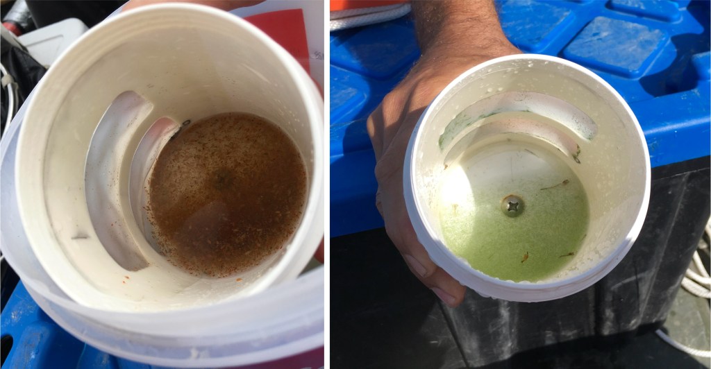 Zooplankton collected in Fox Valley (SK) showed red pigmentation (left) while specimens from Lac Augustin (Qc) had green pigmentation (right).