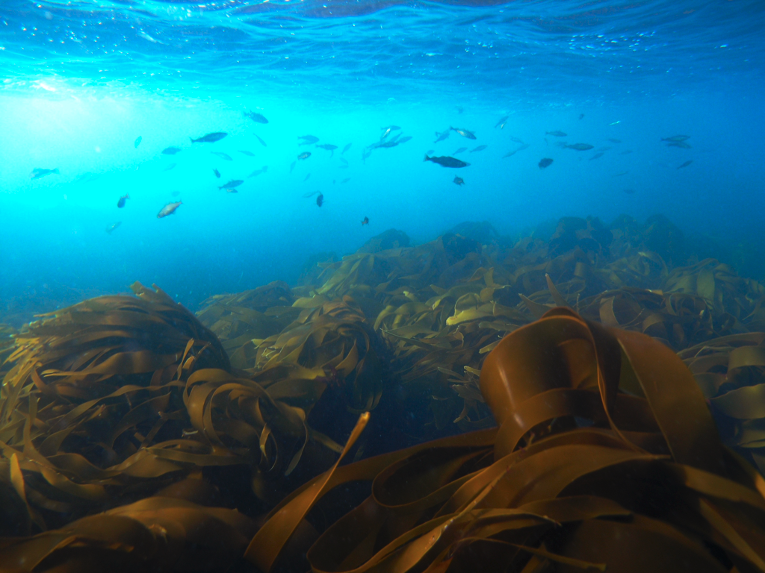 School of gadids hovering over frondose kelp forests ecosystems in the cool-waters of the North Sea (Photo by @Kjell Magnus Norderhaug).