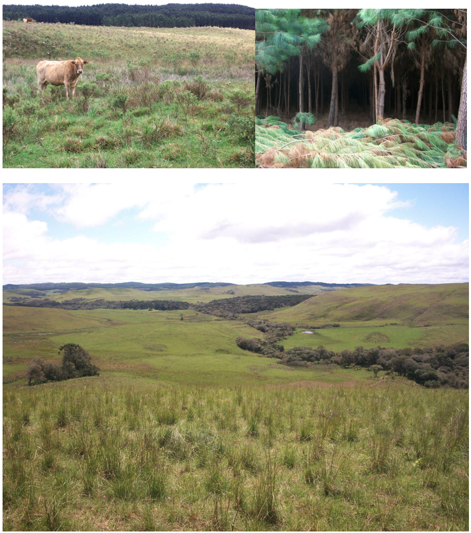 Human modified (top) and natural grasslands (bottom) in the municipality of Palmas, Paraná, southern Brazil. Cattle raising has been a predominant economic activity in the region for at least three centuries. Currently, these grasslands have been afforested with exotic pine or converted into crop fields, resulting in dramatic alterations in the landscape and in the economy of the region. Elusive to the human eye, these natural habitats are filled with a large number of small mammal species with a set of unique traits that provide many important ecosystem functions. Pictures taken by A.L. Luza.