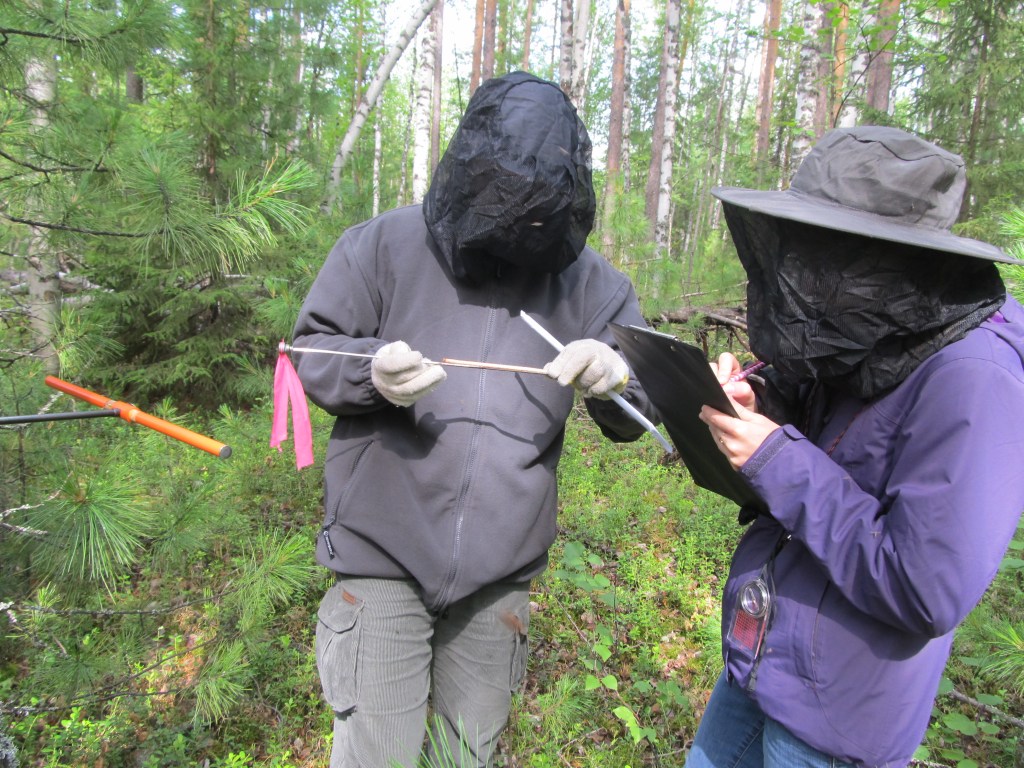 Tree-ring sampling at the margin of the Mukhrino mire complex surrounded by mosquitoes (Western Siberia, Russia).