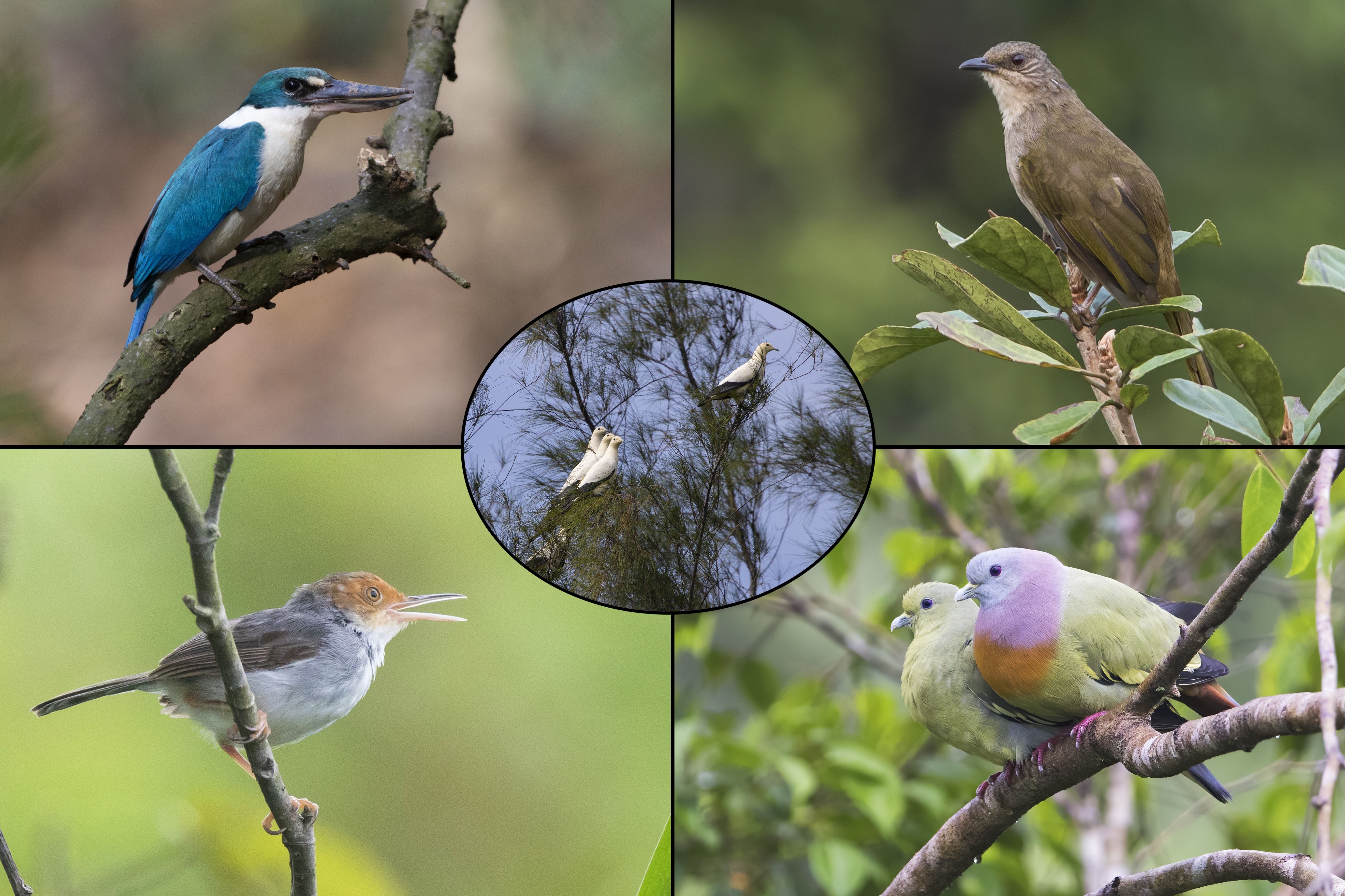 Examples of non-island specialists that are commonly found on small Sundaic islands: top left – Collared Kingfisher Todiramphus chloris; top right – Olive-winged Bulbul Pycnonotus plumosus; bottom left – Ashy Tailorbird Orthotomus ruficeps; bottom right – Pink-necked Green Pigeon Treron vernans. Example of an island specialist that is found across islands in Sundaland: middle – Pied Imperial Pigeon Ducula bicolor.