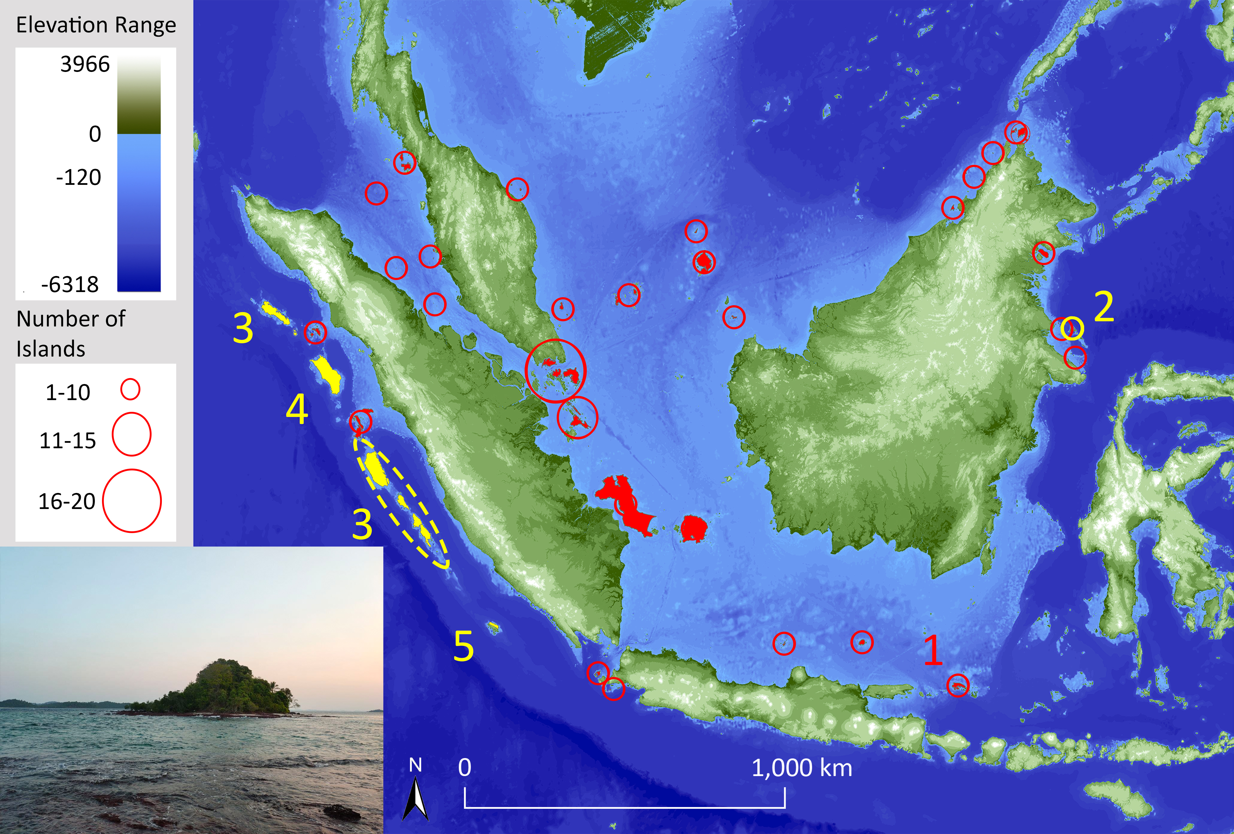 As a consequence of the Sundaland’s complex geologic chronicles, we would expect biodiversity patterns on its islands to be heavily influenced by the past: an island that enjoyed more land-bridge connection to the mainland and used to be bigger throughout evolutionary history should harbour more species. This phenomenon where species richness in an area exceeds the expected value given its size is called supersaturation and is observed in lizard diversity on land-bridge islands in Baja California and birds on some satellite islands of New Guinea. In addition to supersaturation, recently submerged islands that just had terrestrial biodiversity obliterated should be expected to have species composition differing from similar-sized islands that did not drown.