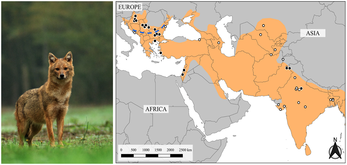 The golden jackal (Canis aureus) is a 10-15 kg canid that is one of the most successful carnivore species in Europe. Its original range included Central and Southeast Asia, the Arabian Peninsula, the Middle East and Eastern Central Europe. Isolated populations lived along the Mediterranean and Black Sea coastal regions until the middle of the 20th century. The species range then rapidly expanded to encompass the entire Balkans in the 1970s-1980s, and further to the north and west such that it is now found across Europe. Within this wide geographic range, the golden jackal also occurs in temperate, sub-Mediterranean, Mediterranean and subtropical climates. It occurs in habitats from grasslands to wetlands to deciduous forests to near-natural and highly artificial anthropogenic habitats, and even in the vicinity of large cities.