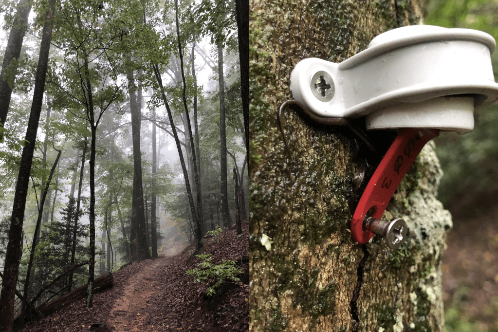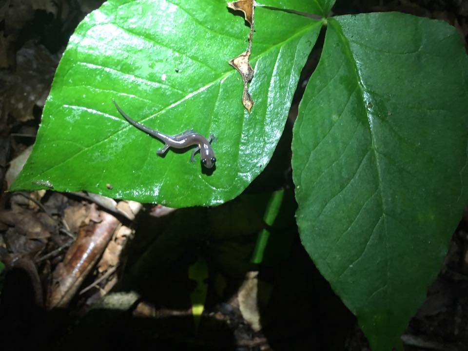 Photos from the field. (Left) “While checking temperature sensors in South Mountains State Park, North Carolina, some low clouds rolled into forest”. (Right) “While I was getting data from a temperature sensor, I found a Dusky salamander taking refuge. I like to think it was my field assistant that day.” – Tom Radomski.