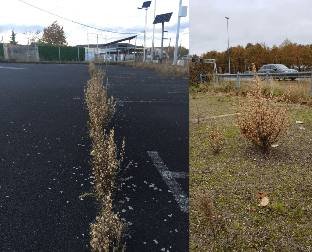 [left] Dittrichia graveolens is a typical ruderal plant and can be found in any kind of disturbed environment, like this crack in the pavement in its native range in southern France. [right] Highways are key range expansion corridors for Dittrichia graveolens, as shown here at the northern range limit in the Netherlands. (photo credit: Nicky Lustenhouwer)