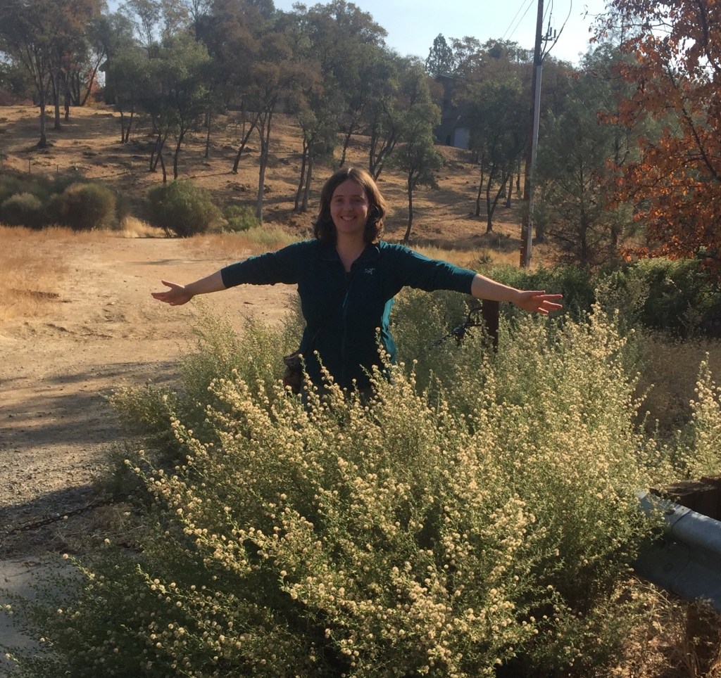 Nicky Lustenhouwer with a particularly large individual of Dittrichia graveolens during fieldwork collecting seeds in California. (photo credit: Nicky Lustenhouwer)