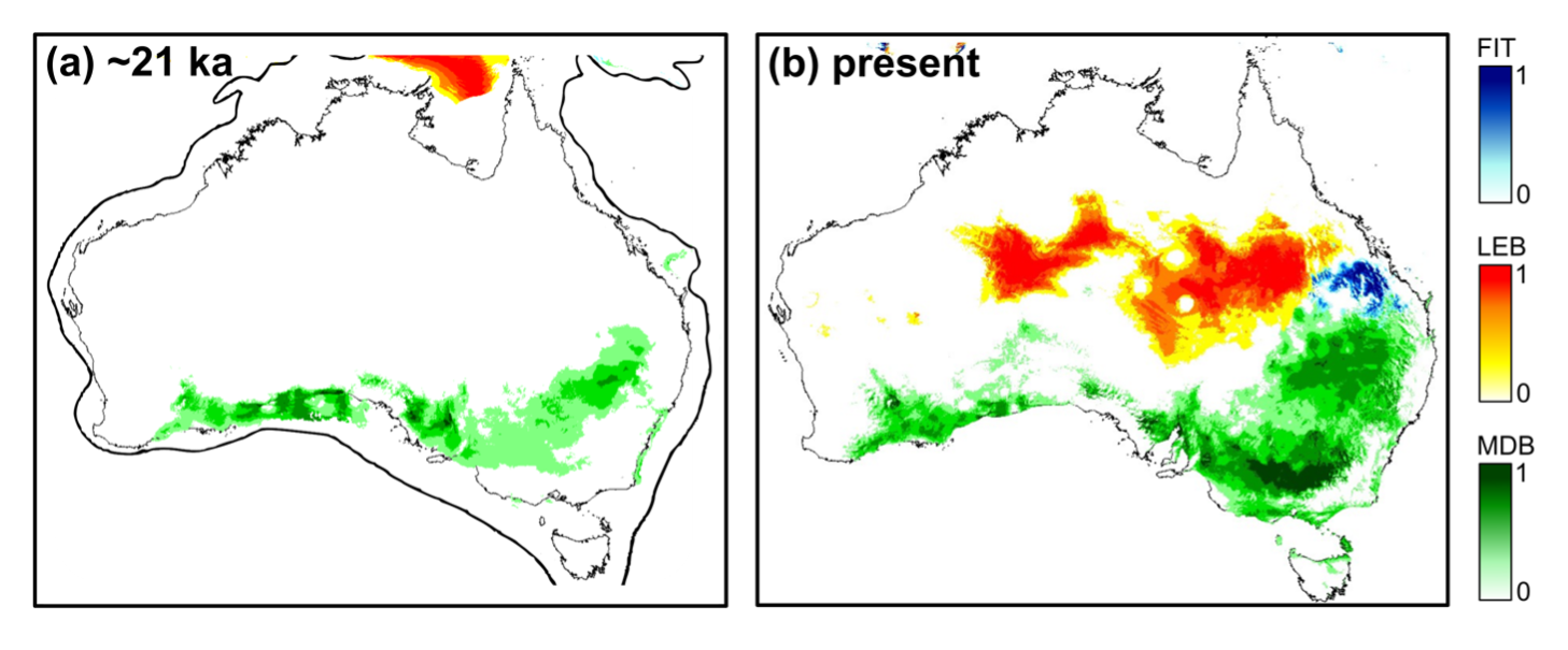 Species distribution models for three golden perch lineages that are endemic to three major Australian drainage basins: Fitzroy (FIT), Lake Eyre (LEB), Murray–Darling (MDB). We found support for reduced habitat availability during the Last Glacial Maximum (~21 ka) compared to the present day.