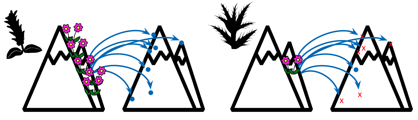 Schematic representing the impact of habitat specialization in range expansion. In the left panel, a generalist like Salix pyrenaica showing multiple successful dispersal events. In the right panel, for a micro-site specialist like Cirsium glabrum, most of the dispersal events will not succeed.