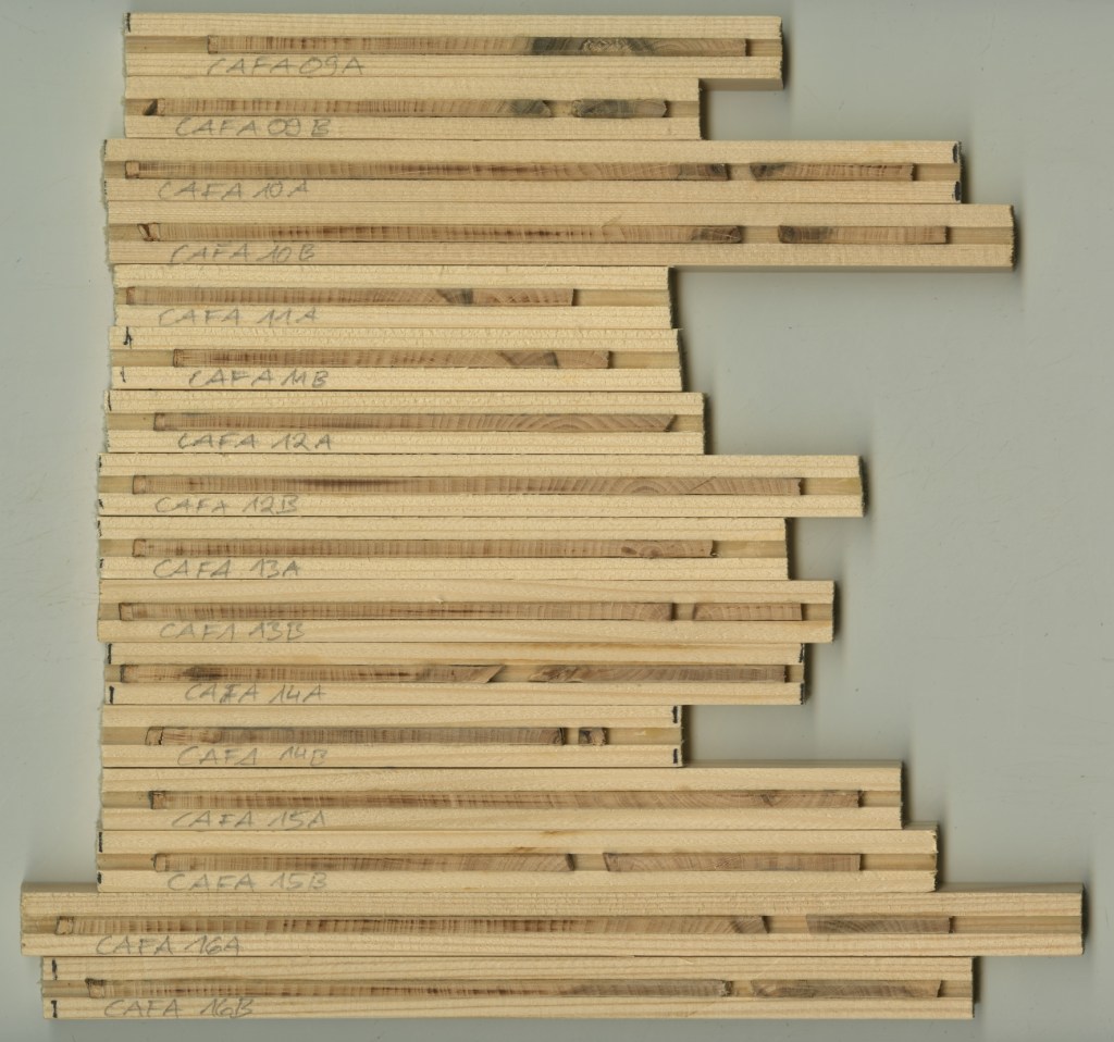 Samples of wood are the basis of our study. These samples were taken from European beech. They are glued to wooden strips and prepared with razor blade or sandpaper so that the annual rings are clearly visible on the smooth surfaces and can be measured and dated using a microscope (Photo Credits: Stella Gribbe).