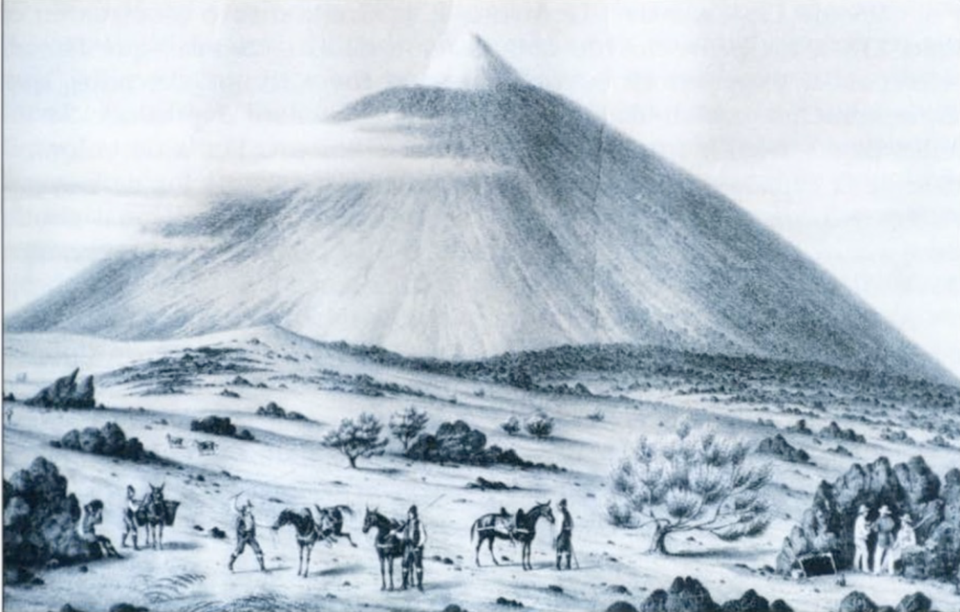 Las Cañadas plain ca. 1830, in the route to the Teide ascension from Orotava valley. It can be seen the sparse vegetation existing, product of the herbivory pressure of introduced goats and rabbits (Source: J.J. Williams).