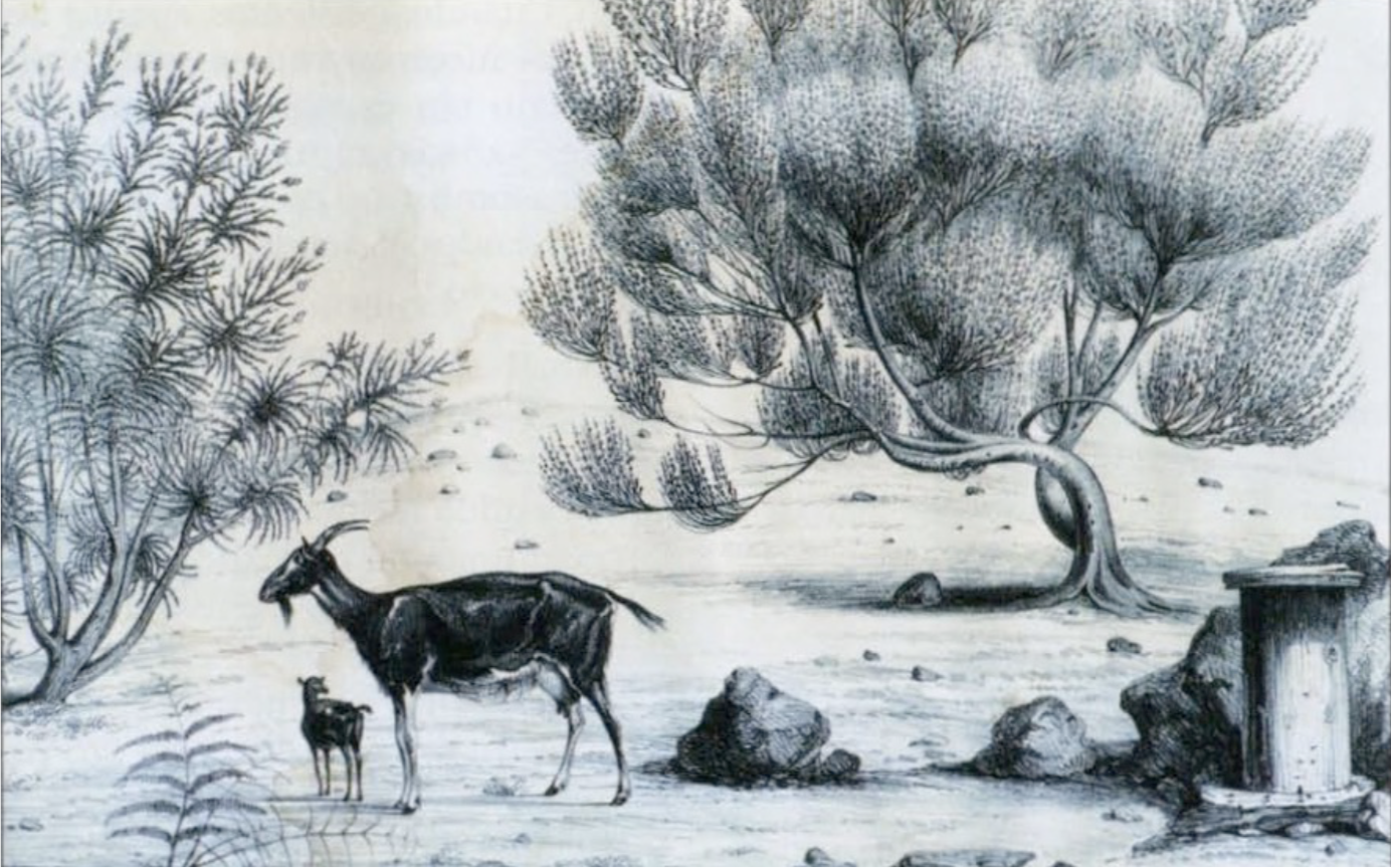 Las Cañadas zone ca. 1830, with a goat and her calf and a beehive, indicative of the important use given to this part of the island at that time (Source: J.J. Williams).