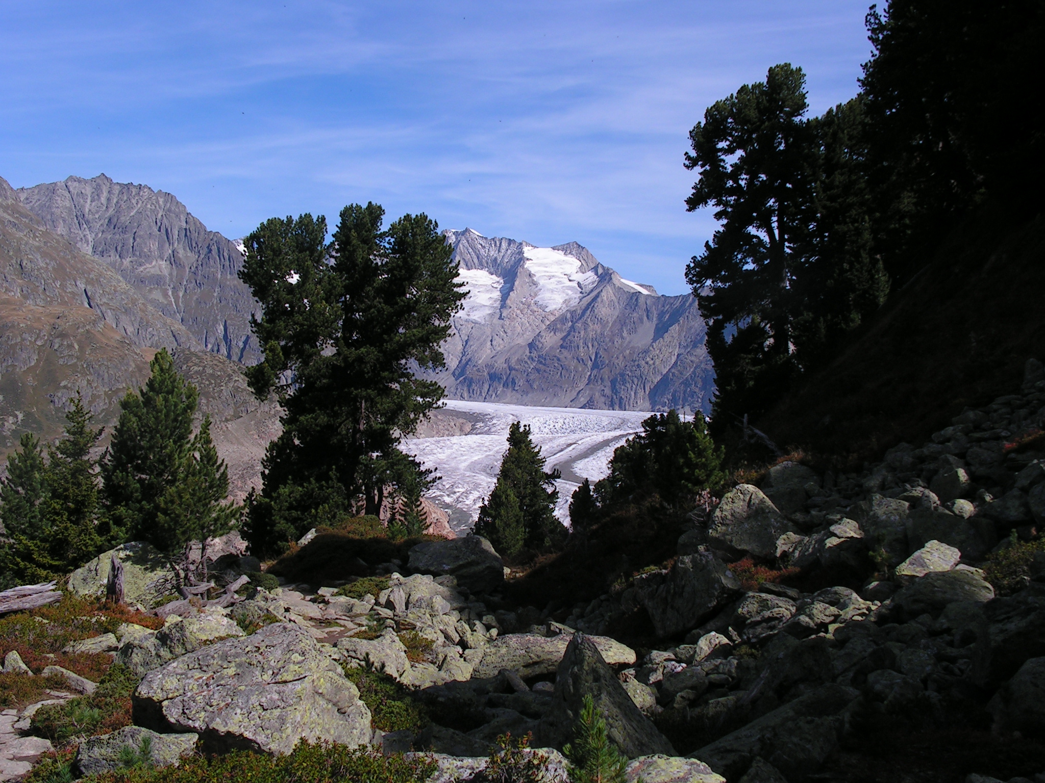 Above: Field site with a view: Swiss stone pine forest on Riederfurka above Aletsch glacier, with a historic monument in the foreground and geological monuments in the distance (photo: Felix Gugerli).