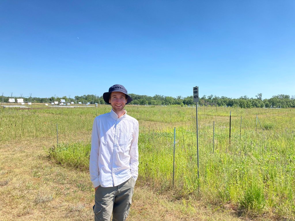 Josh standing in ‘BigBio’, one of the longest-running experiments testing the role of plant diversity on ecosystem function.