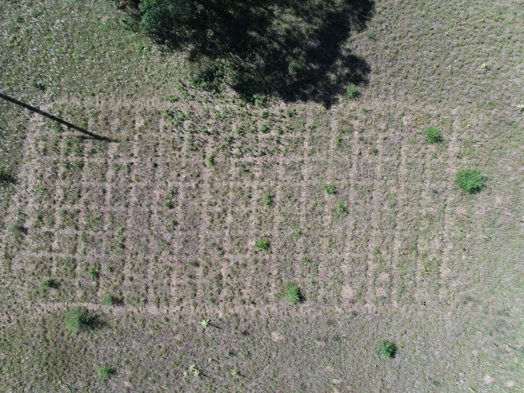 Experimental plots like these are common in plant ecology. But how transferable are findings from this experiment to plots that are bigger or smaller? (Drone photo Maggie Anderson; experimental set-up Josh Brian)